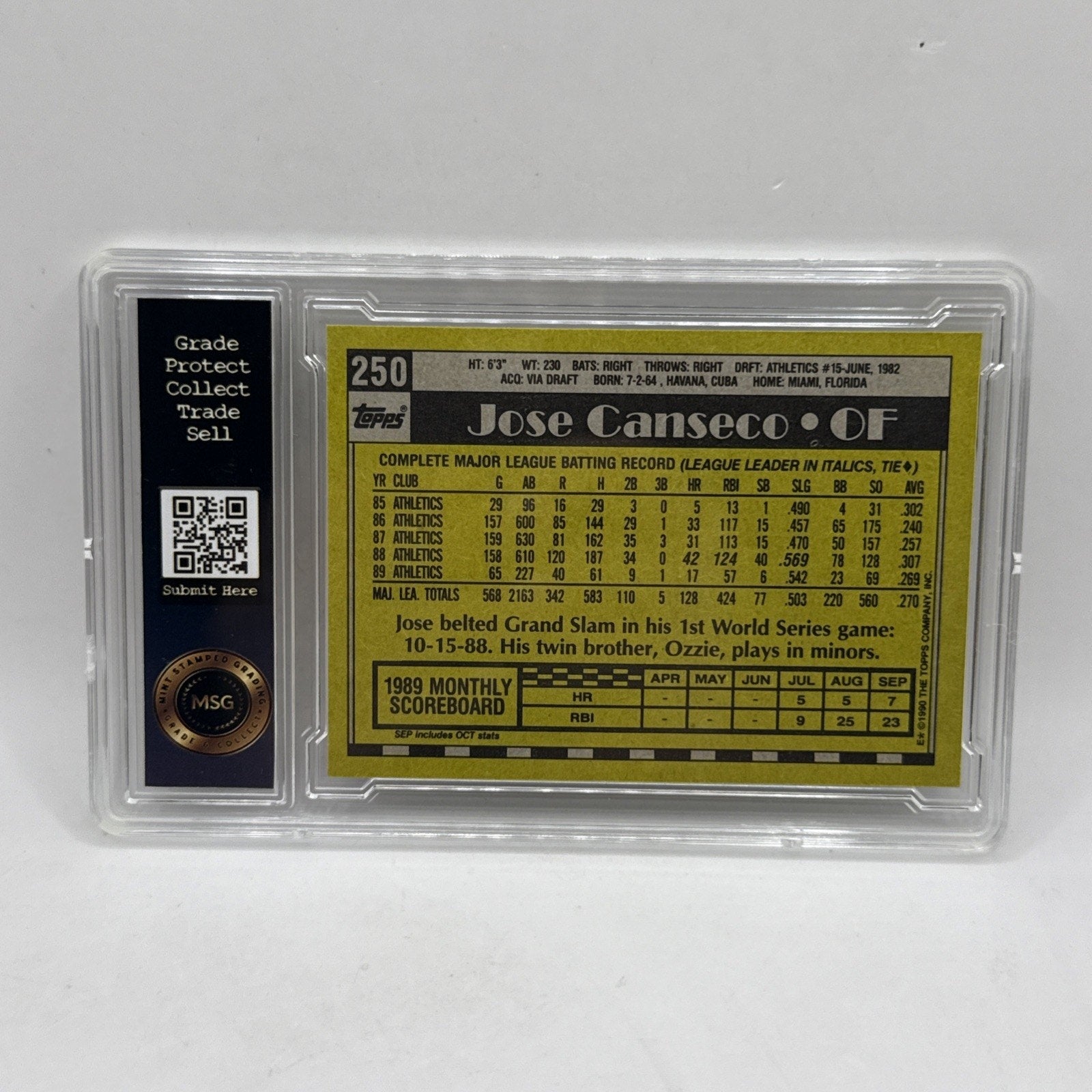 1990 Topps Baseball #250 Jose Canseco, Oakland Athletics Graded 4 MLB Vintage