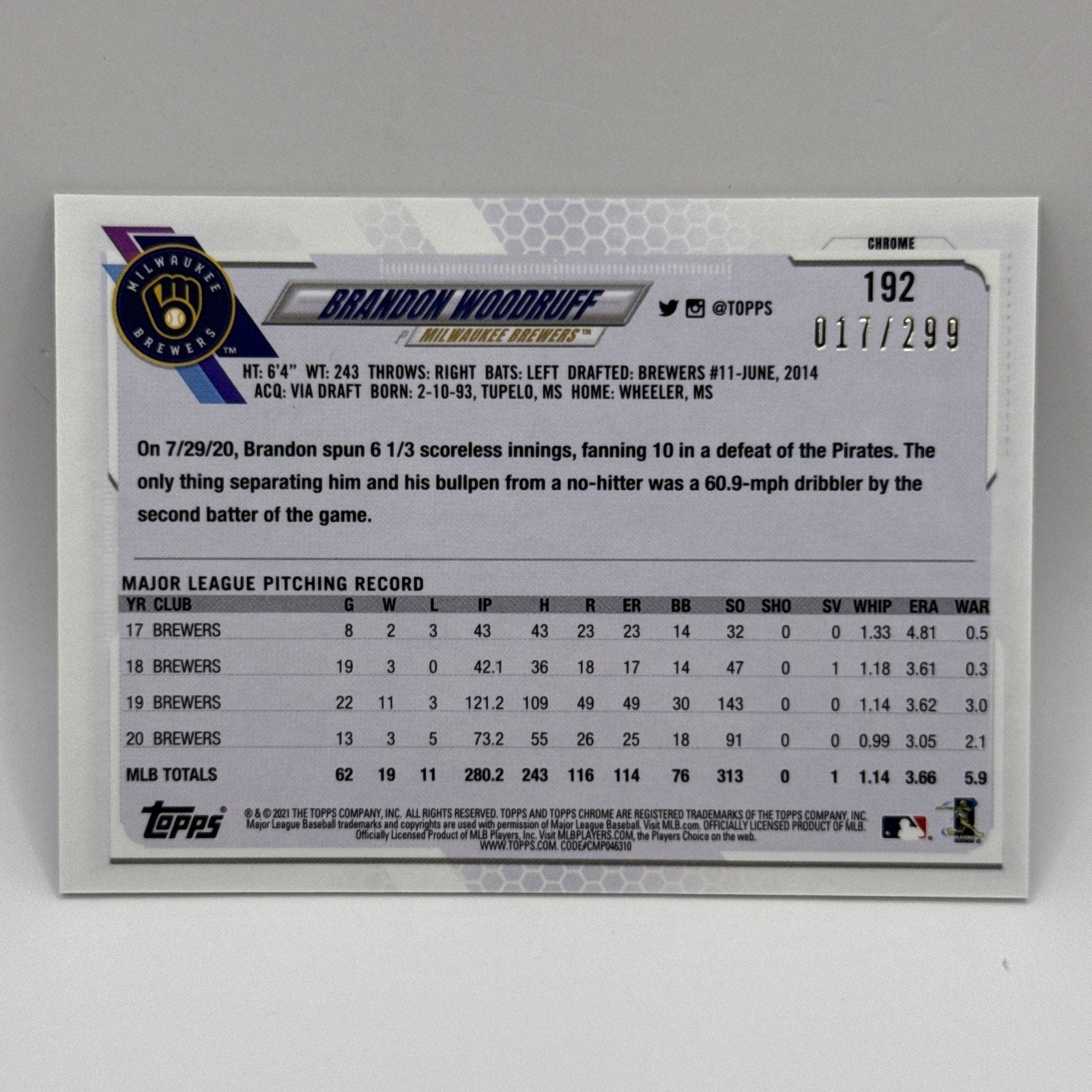 2021 Topps Chrome Brandon Woodruff (Brewers) Purple Refractor /299 Card No. 192