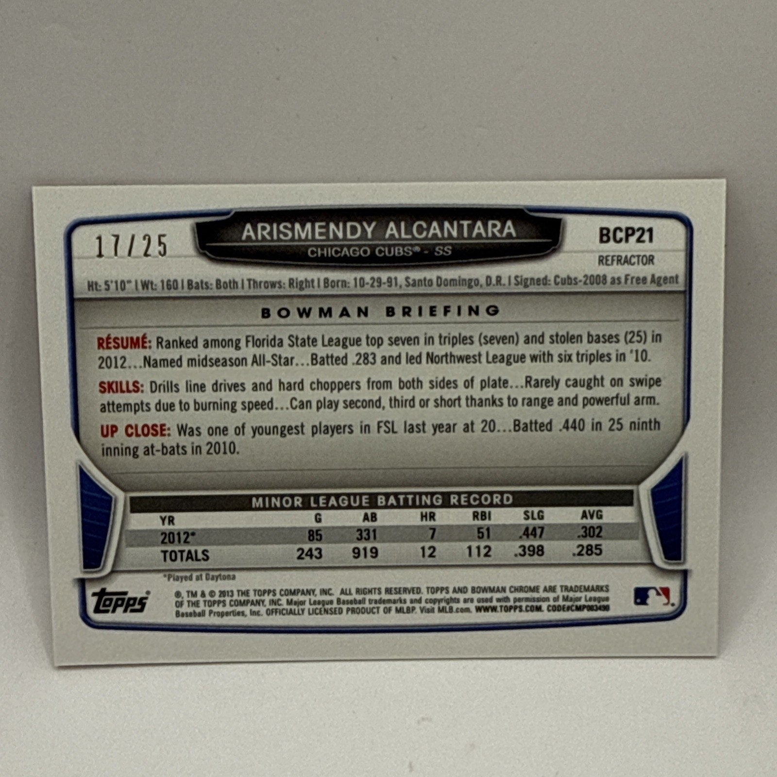 ARISMENDY ALCANTARA 2013 BOWMAN CHROME #BCP21 ROOKIE ORANGE REFRACTOR /25 MLB