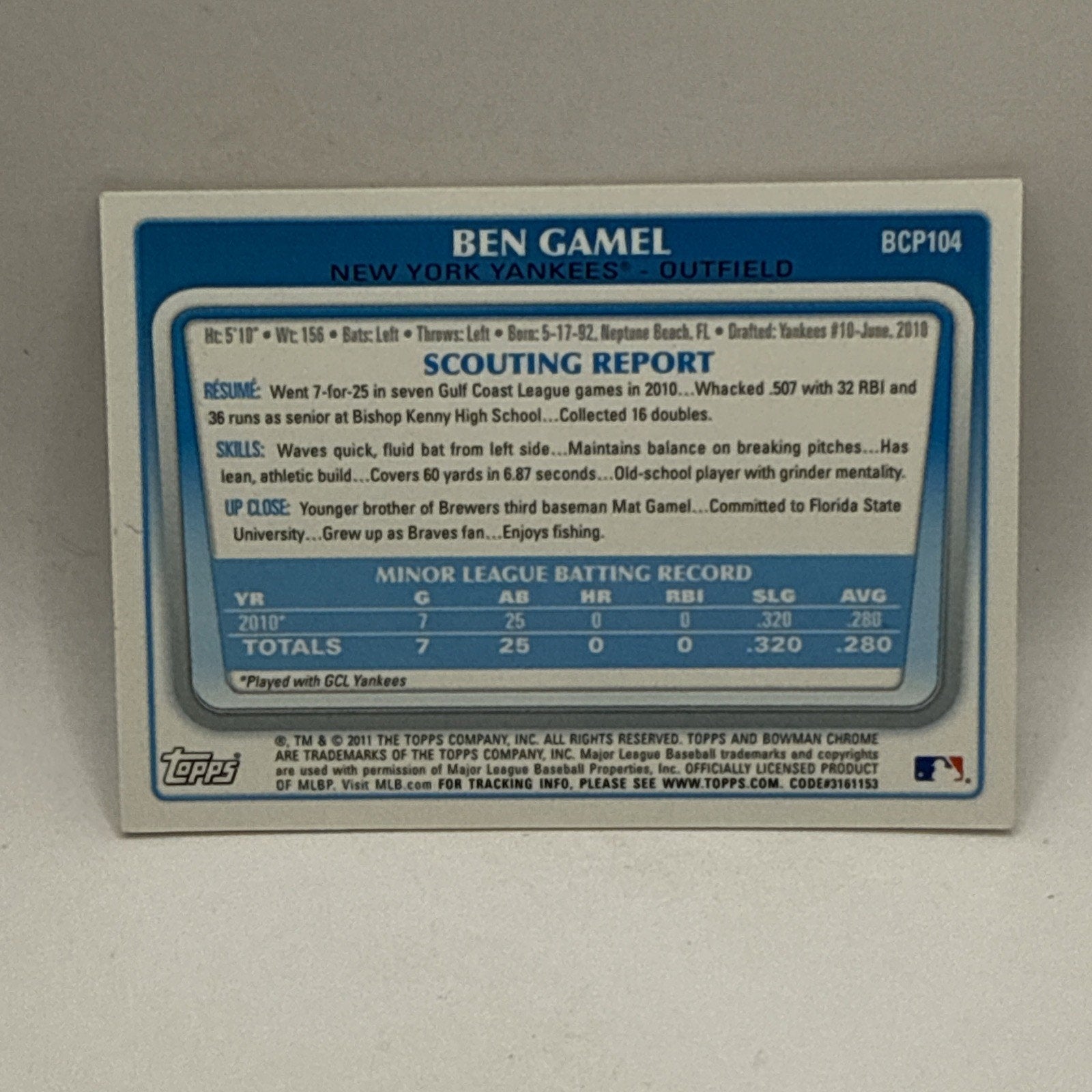 BEN GAMEL NEW YORK YANKEES SIGNED 2011 BOWMAN CHROME CARD #BCP104 MLB